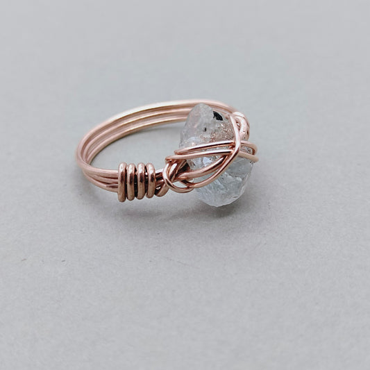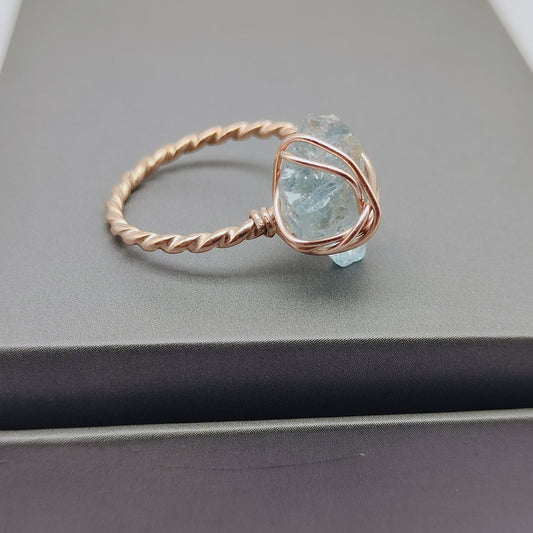 Aquamarine stone sterling silver rose gold plated ring - wired ring - Raw Gemstone Ring- Hand Crafted Bohemian Ring - summer gift