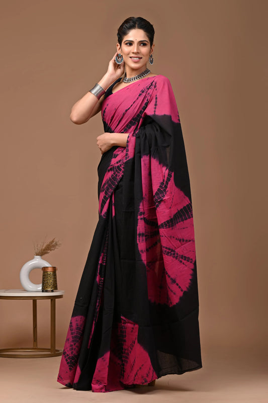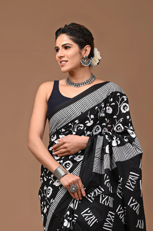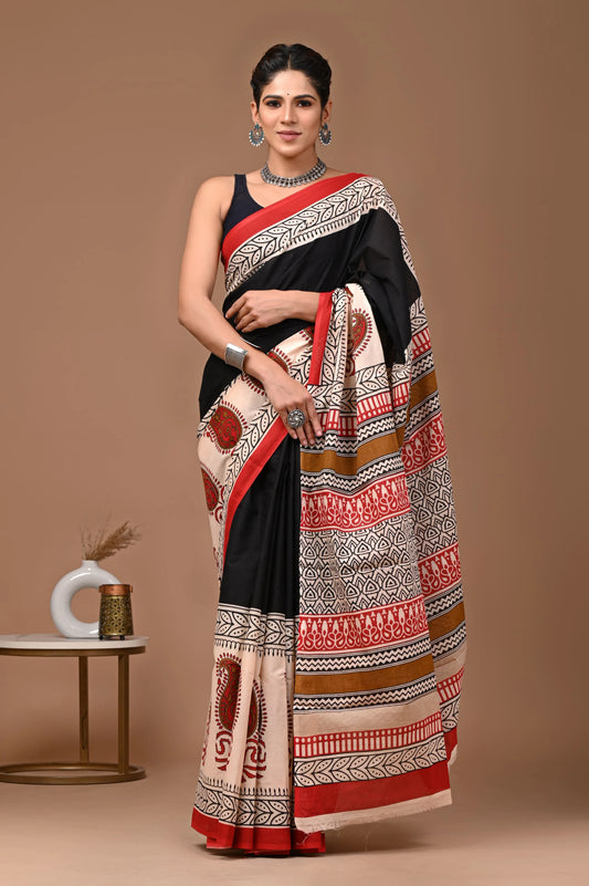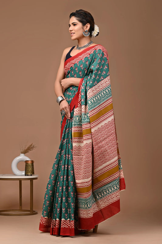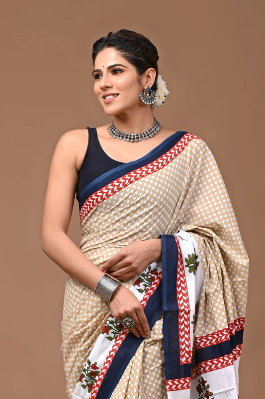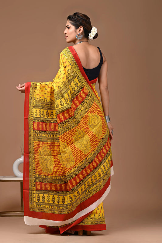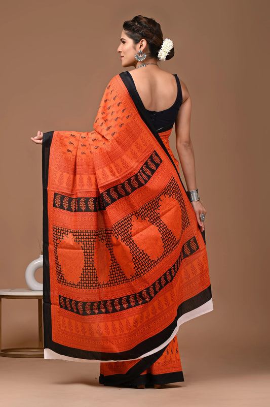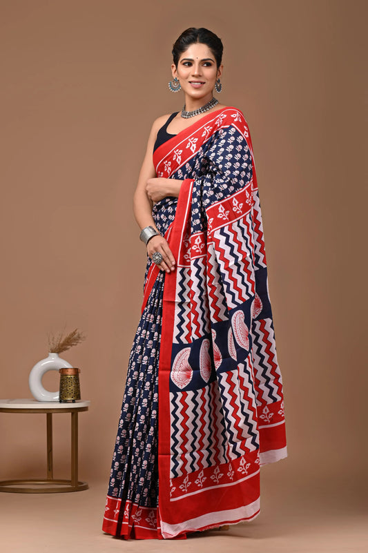 Hand block printed cotton mul-mul saree