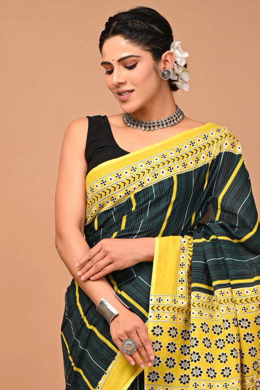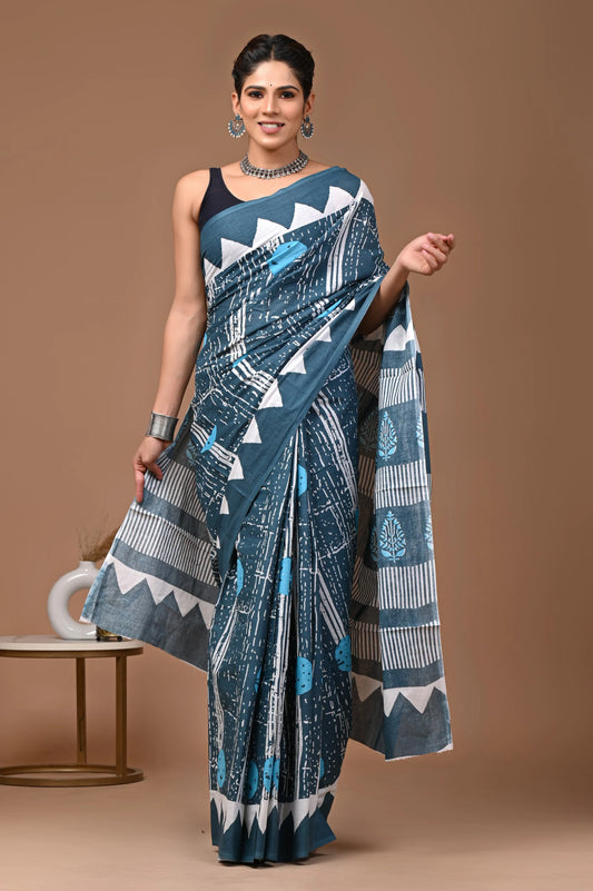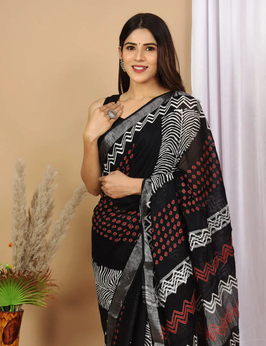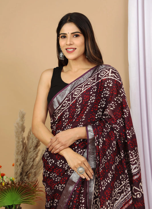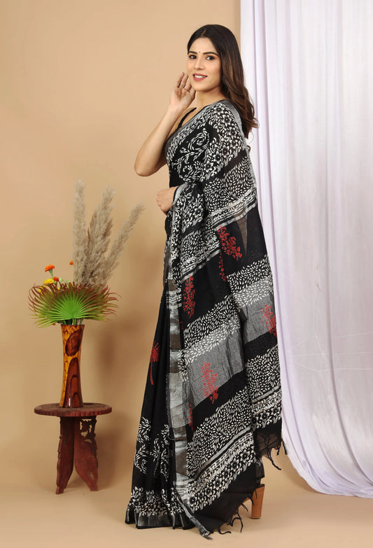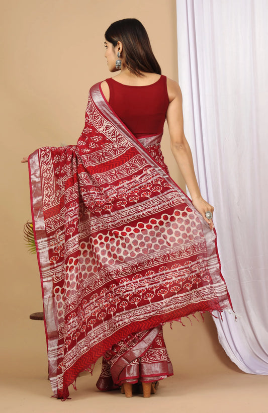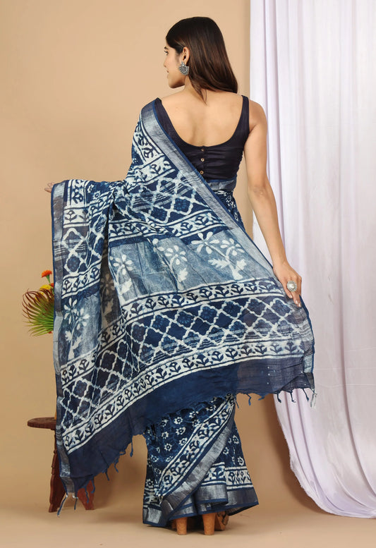 Linen Cotton Hand-Block Printed Saree