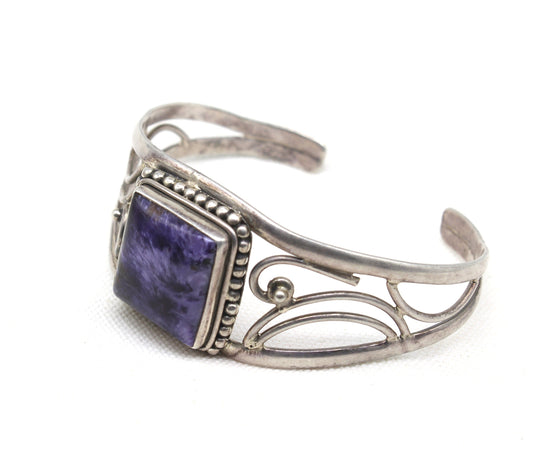 Boho-Armreif | Massives 925er Sterlingsilber mit quadratischem Charoit-Stein | Handgefertigtes Design-Armband | Boho-Schmuck für Frauen | Geschenk für Sie
