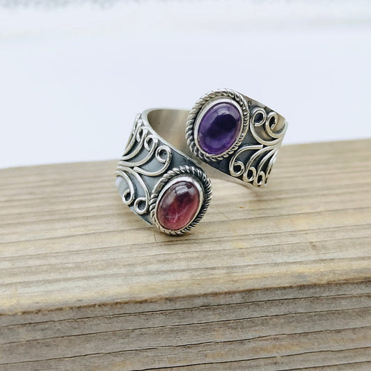 Natürlicher verstellbarer Bandring aus Amethyst und Rubin, handgefertigter silberner Bandring, Spinnerschmuck, Amethyst- und Rubinring, Ring