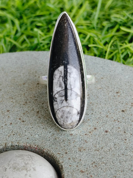 Orthoceras Fossil Ring - Sterling Silber Auffälliger schwarz-weißer Orthoceras Fossil Ring - Großer Stein Ring - Schwarzer Stein Ring - Kuber Ring
