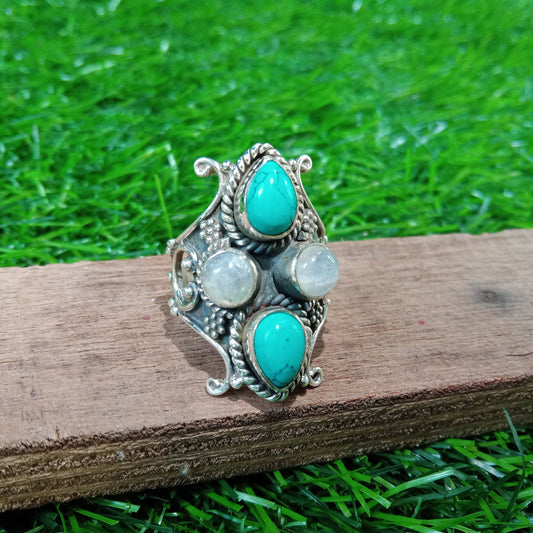 Türkis- und Mondstein-Ring aus 925er Sterlingsilber - handgefertigter böhmischer Ring - Doppelsteinring - Türkis- und Mondsteinring - Geschenk für Frauen