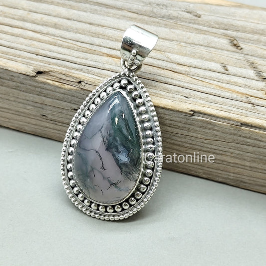 Handmade Moss Agate Pendant of Solid 925 Sterling Silver, Beautiful Moss Agate Pendant in Teardrop Shape, Boho Pendant Gift for her