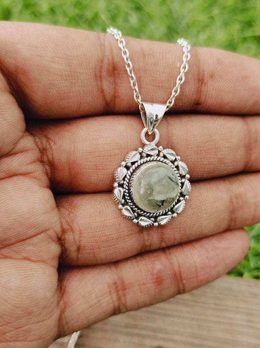 Prehnite Natural Gemstone Pendant in Solid 925-Sterling Silver |Gorgeous Handmade Prehnite Gemstone Round Pendant |Boho Pendant Gift for Her