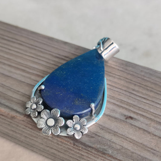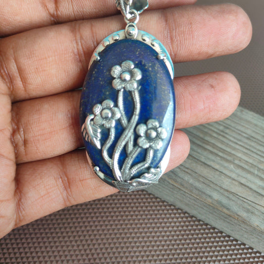 Natural Lapis Lazuli pendant , handcrafted bohemian pendant , lapis stone pendant , flower designed pendant , big size pendant , bohemian