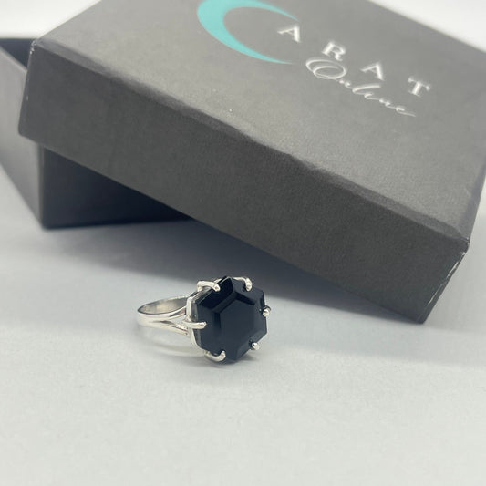 Bague Boho Statement - Bague en argent sterling avec pierre d'onyx noir - Bague bohème fabriquée à la main - Bague en pierre de forme hexagonale - Bagues - Cadeau pour elle